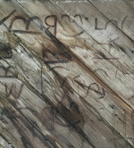 Artifact is the front door of the blacksmith business with farm brands burned into the wood. The branding iron imprints document early 1900 farm brands in the Boulder valley.