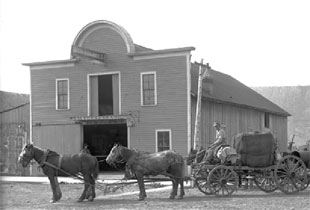 This livery stable in Rifle is a one and one-half story false front. Instead of a flat parapet, a semicircular pediment hides the upper gable end. Triangular peaked parapets are another common variation.