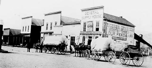A row of false front commercial buildings gives early 1880s Main Street in Dillon a prosperous and established appearance.