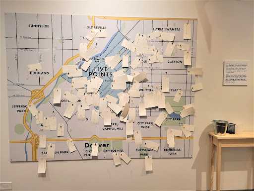 Map depicting five points in the exhibit. Pins with notes are covering signifcant Denver locations.
