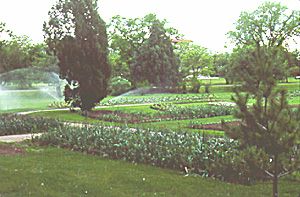 A photo of the green park with many green trees and hedges