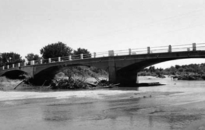 A black and white photo of the bridge with railings and abutments widely spread below over a river.