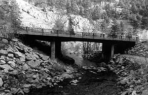 Constructed in a rugged mountain setting over Boulder Creek in 1953, the three span bridge runs for 100 feet, with the main 48-foot span flanked by shorter approach spans.
