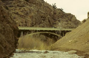 Reportedly the last bridge by the prolific Pueblo Bridge Company, this 1932 two-ribbed, reinforced concrete, open spandrel deck arch in Fountain Canyon was designed by King Burghardt.