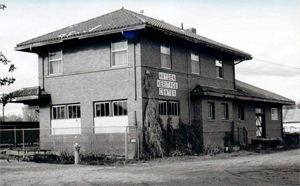 A photo of the depot in black and white with two stories and hipped roof over pitched roof on the right side.