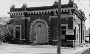 A black and white photo of the dark station from a slight angle and elaborate white trim and phone pole in front.