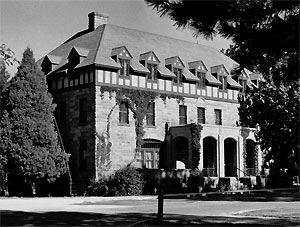 A black and white photo of the building with tall hipped roof and dormer windows protruding. On either side are large trees.