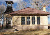 As the only public building on the rural landscape, it was not only a center of education, but also a focus of community life, hosting a variety of activities. In its size, scale, window placement, and interior configuration, the building epitomizes the rural schoolhouse. Its clustered windows and hipped roof reflect turn-of-the-century “innovations” in rural school design. The predominant architectural feature on this building is its corner belfry/entrance with an unusual concave roof slope. This property is associated with Rural School Buildings in Colorado Multiple Property Submission.