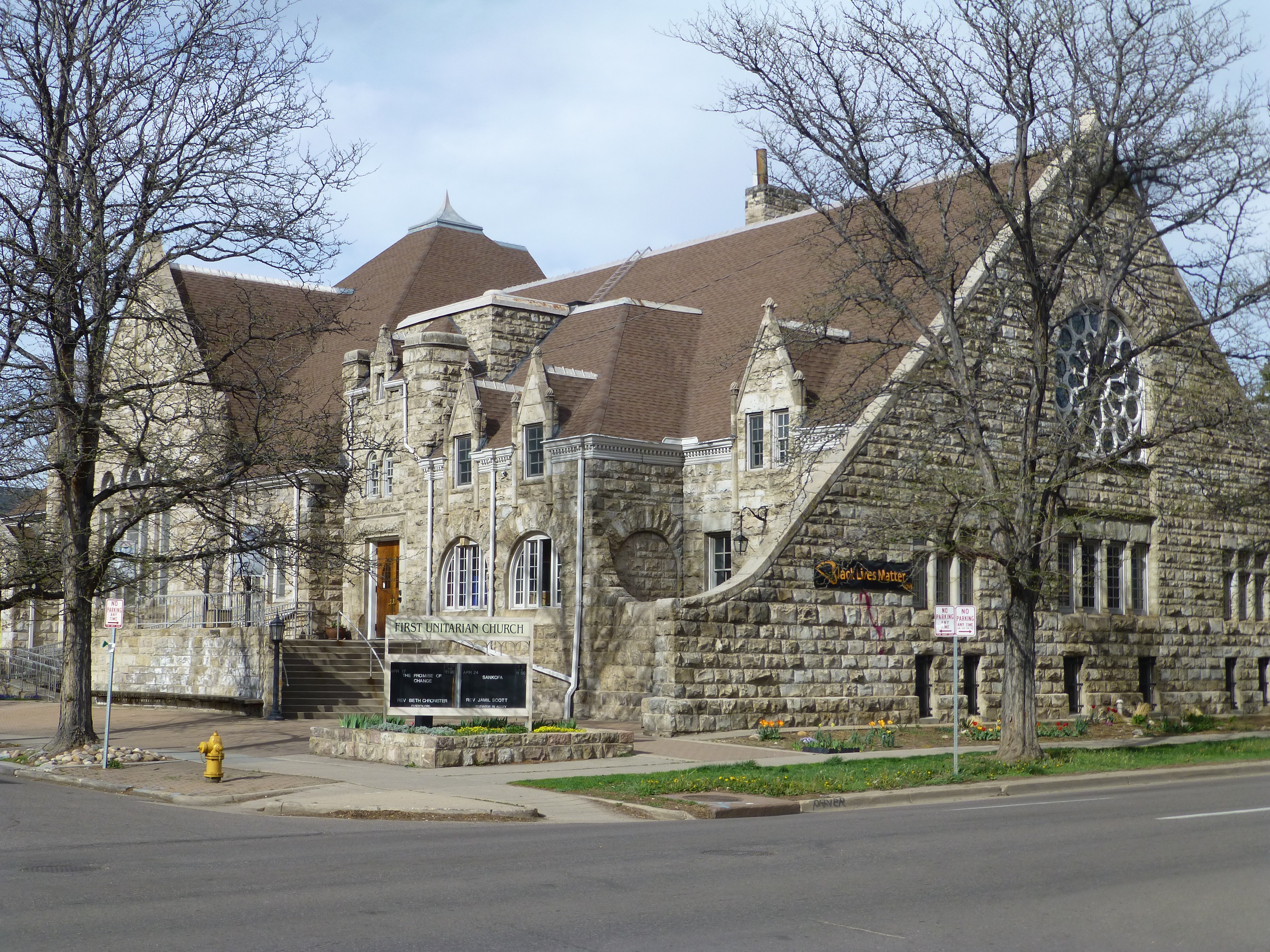 Built in the 1890s, the First Unitarian Society Church is a unique example of construction using locally sourced rhyolite in the Richardsonian Romanesque style. First Unitarian Society of Denver has occupied the building since 1958, and has been involved in community work and social justice advocacy since its founding.
