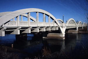 Charles Sheely’s Colorado Bridge and Construction Company completed this multi-span, reinforced concrete fixed rainbow arch in 1923.