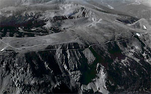A black and white photo of the road on a steep treeless ridge.