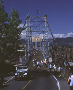 It is the state’s only bridge constructed primarily for recreational use, as well as the only remaining vehicular suspension bridge.  With a main span of 880 feet and a height of 1,053 feet, at the time of its completion in 1929, it was considered to be the largest suspension bridge west of the Mississippi River.  Listed under Highway Bridges in Colorado Multiple Property Submission.