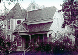 Constructed circa 1890, the large two-story wood frame Queen Anne style residence features clapboard siding and a distinctive polygonal corner tower.