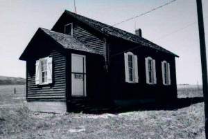A black and white photo of the dark school house with gabled roof, white shudders and white door on the left.