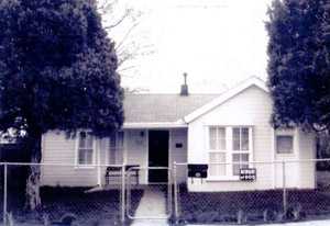 A photo of the house from directly in front with chain link fence in front with gabled roof on section on the right and covered porch extending out from the left. On either side stand two leafy trees.