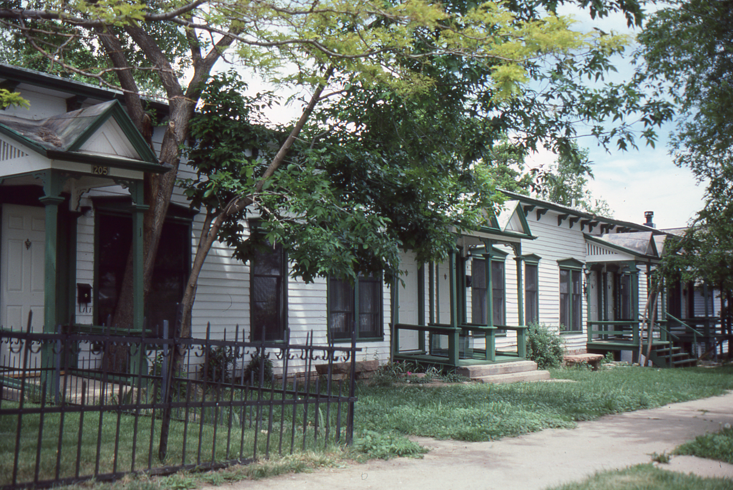 A rare example of a wood frame terrace house, the eight unit building is flat roofed and faced in narrow clapboards which emphasize the vernacular Colonial Revival detail of the exterior.