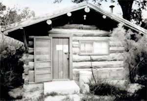 A black and white photo of the cabin with overhanging gabled roof and entrance on left below surrounded by log walls.