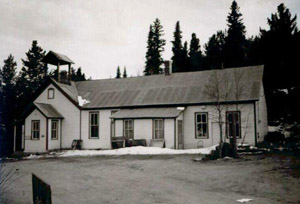 A black and white photo of the building with sloping roof, and extension on the left, in the background are tall evergreen trees.