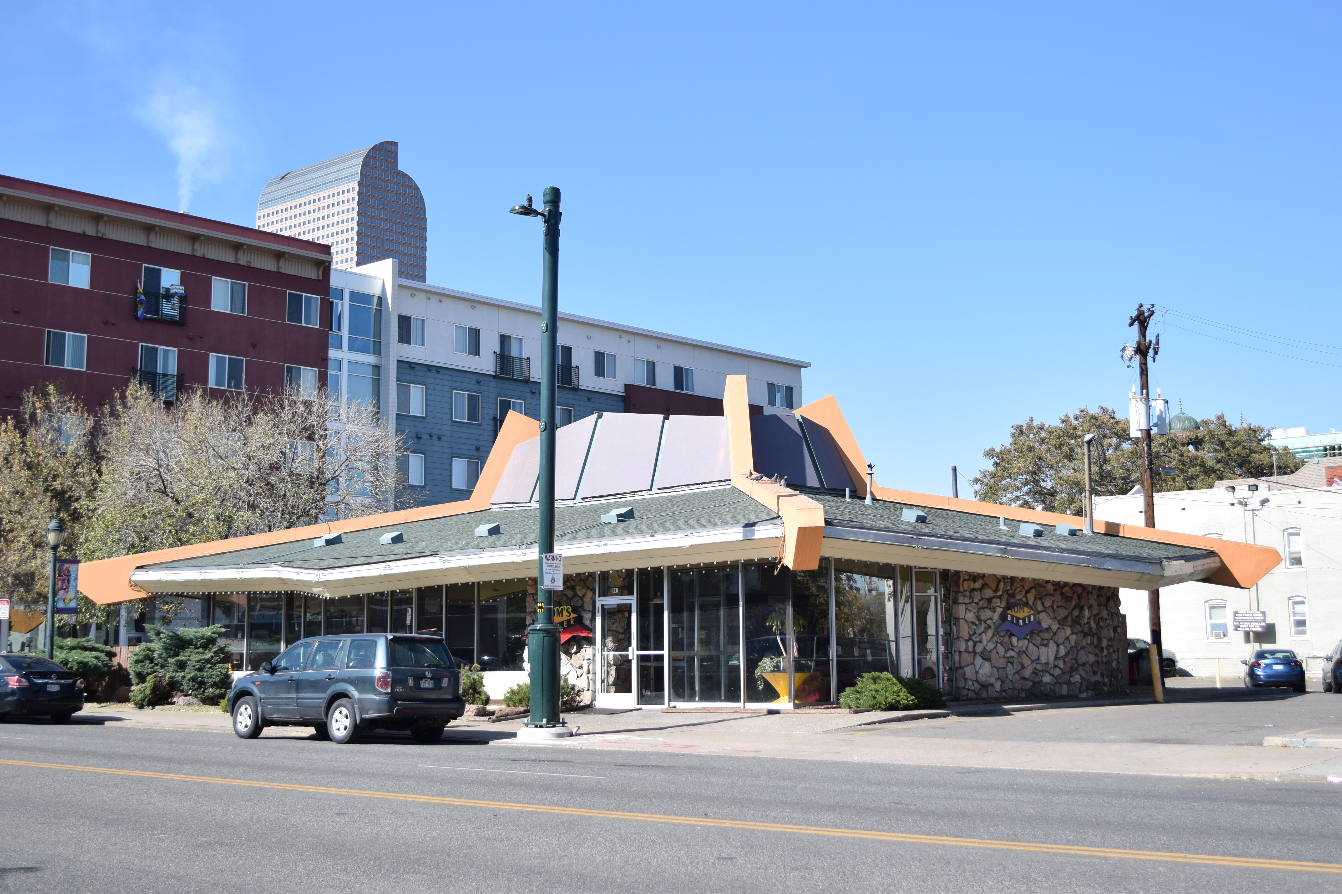 Representative features of the style embodied by the White Spot include the eye-catching roof form, large plate-glass windows, and playful interior design. A well-known and beloved place along East Colfax Avenue, the restaurant was part of a chain of Denver restaurants first established by William F. Clement in 1947 that comprised nine locations in 1967. After 1990, the building housed a number of restaurants until 1999, when Tom Messina opened Tom’s Diner, which continues to operate in the storied building today. The White Spot Restaurant is listed under the Commercial Resources of the East Colfax Avenue Corridor Multiple Property Submission.