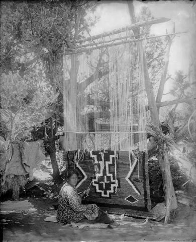 This image of a Navajo woman seated at a loom with a partially finished blanket was selected to represent a collection of 645 18 x 22 inch "mammoth" glass plate negatives photographed by William Henry Jackson ca. 1890-1910.