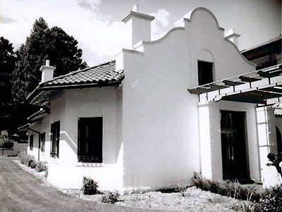 The Mission style is easily recognized by the curvilinear-shaped gable wall or the low parapet wall rising above the roofline. The style is characterized by smooth stuccoed or plastered wall devoid of ornamentation. The roof is usually tile, and semicircular arched openings form windows, entries and arcades. A small round window or ornament may appear in the center of the gable. Roofs may have overhanging eaves with exposed rafters. Towers and iron balconies are found on larger buildings.
