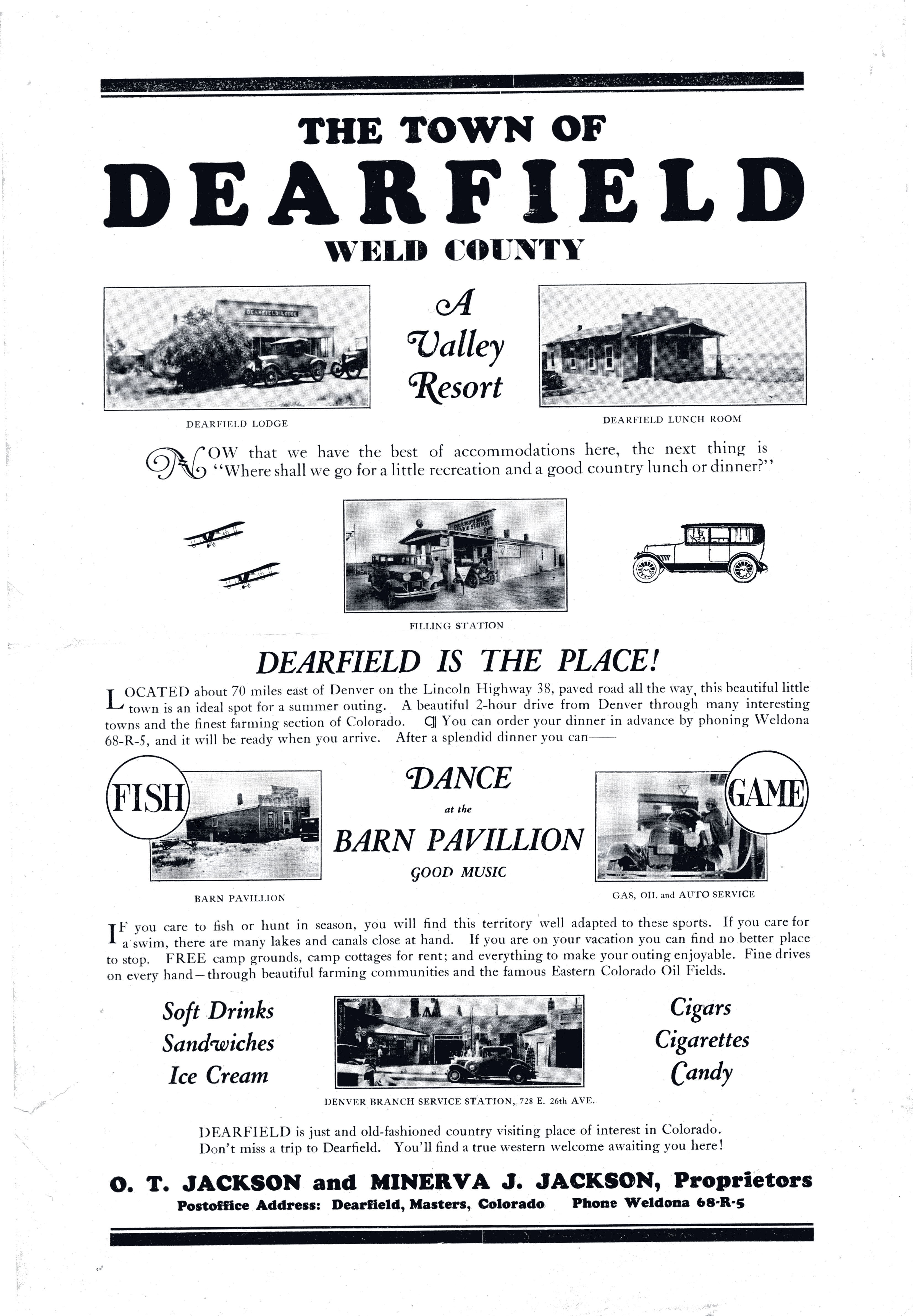 Dearfield was an African-American agricultural colony established in Weld County in 1910. The town was envisioned as a self-sufficient community for African-Americans following the principles of Booker T. Washington's "go back to the land" movement. O. T. Jackson, an African-'American entrepreneur, worked with other African-American leaders in Denver to purchase land for the community. During the 1910s, the town grew to approximately 300 residents, including two churches, a school and a restaurant. There were plans to build a canning factory, sanatorium and college. It was seen as a national success, and drew visitors and colonists from around the country. According to an article in the 1917 'Southern Workman,' "No Negro of prominence now visits Colorado without paying a part of his visit to Dearfield." Both the downturn of the agricultural market after the First World War and the climate disaster of the dust bowl devastated the farmers of Dearfield. Only twelve residents were left in the community by 1940, with the rest of the citizens having to abandon the dream.