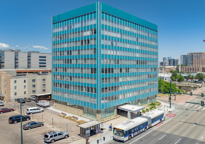 Exterior of 655 Broadway, the turquoise multistoried offices in Denver.