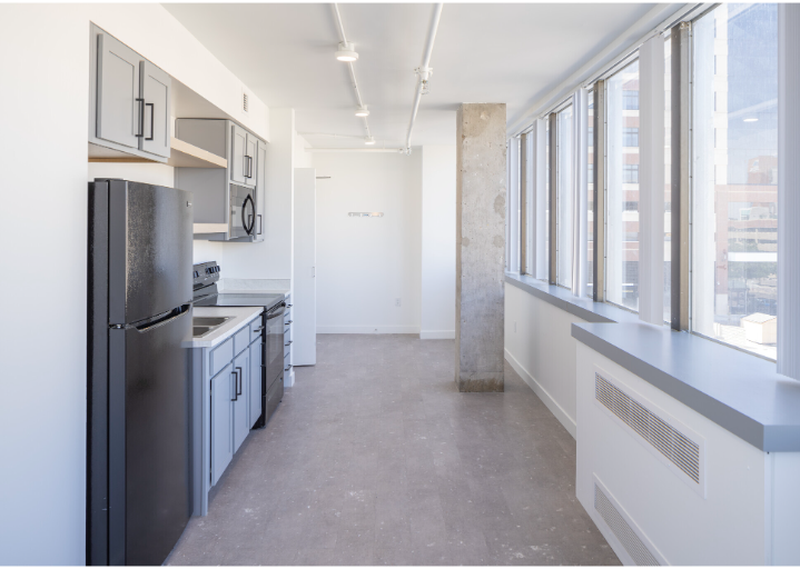 Interior of living space and kitchen at 655 Broadway