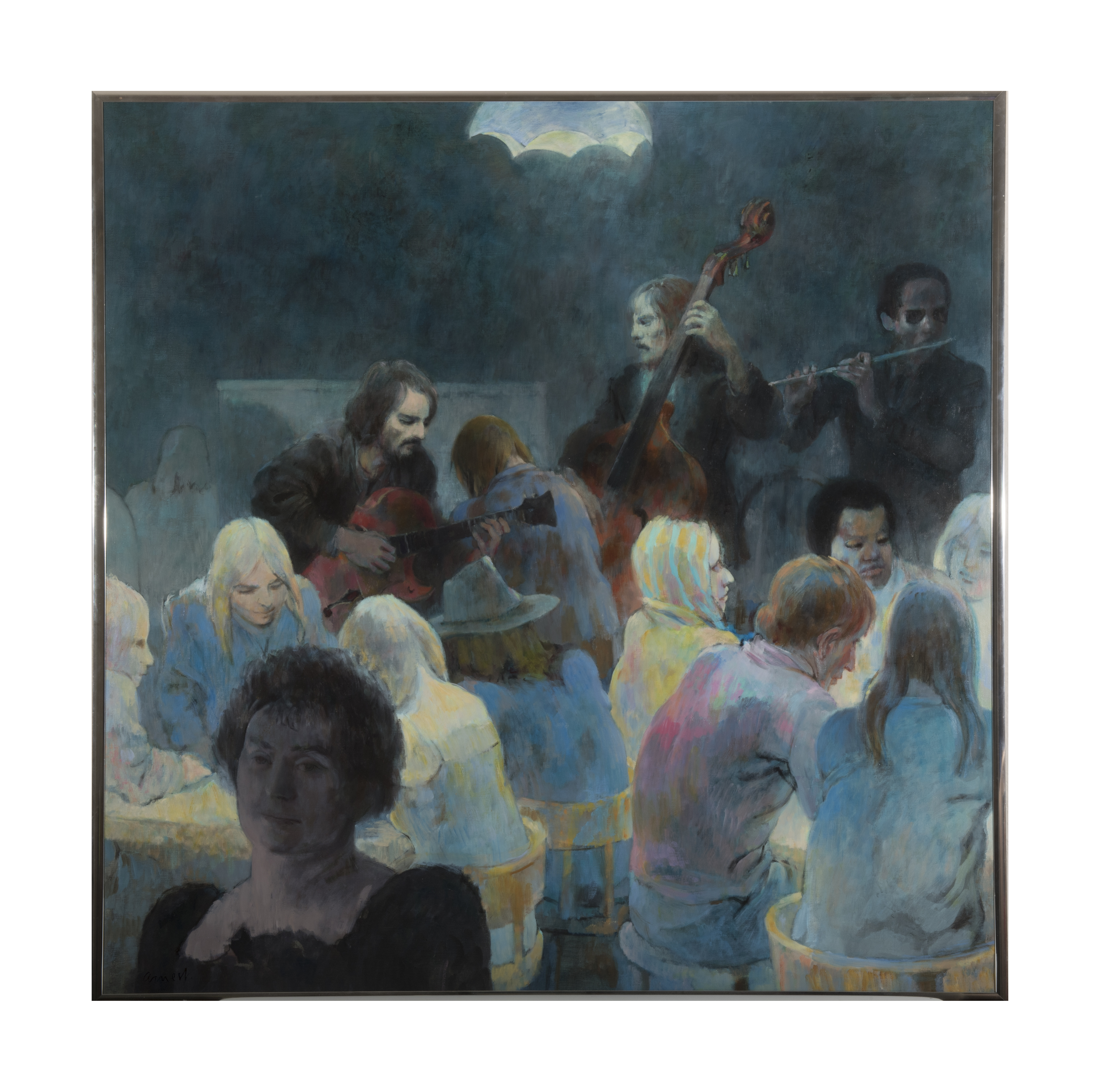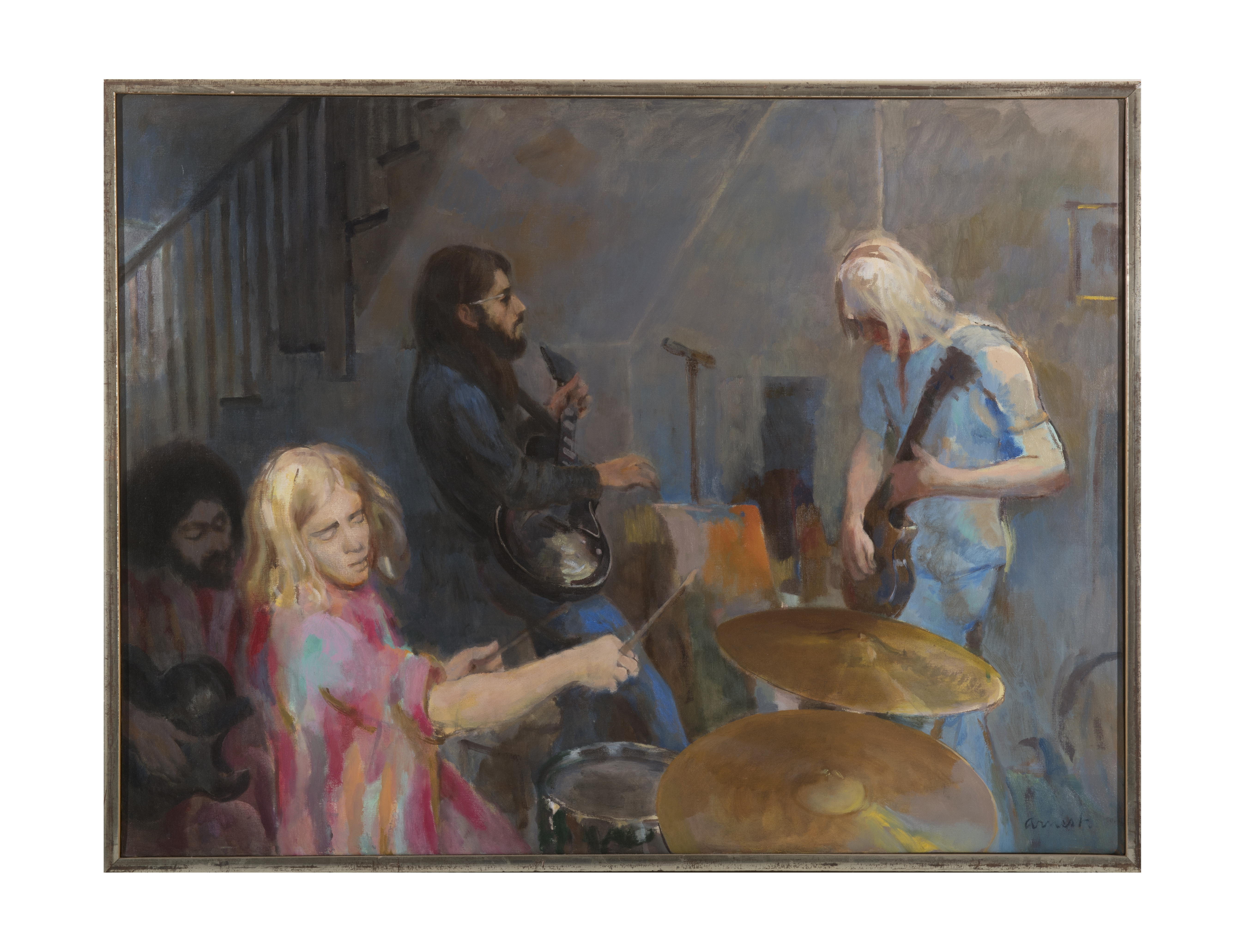 In the 1970s he painted scenes of musicians that he regarded as allegorical fictions of the ideal human community. He also made sketches of his son Mark’s high school rock ’n’ roll band , which practiced at full volume in the Arnest family living room, resulting in fifteen images with color and marvelous composition.
