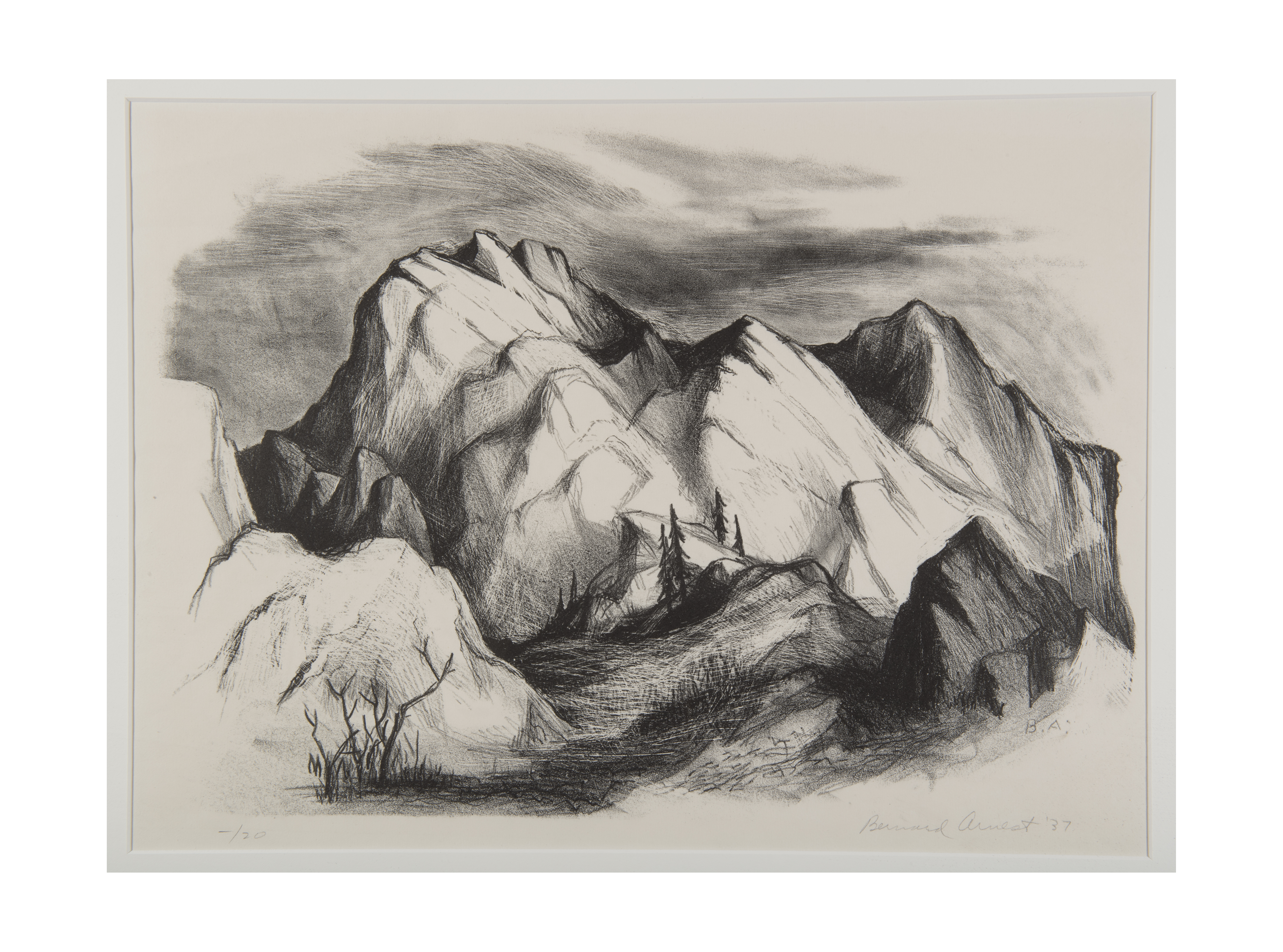 This idea resonated with some students at the Fine Arts Center, including Arnest, who studied lithography in the center’s summer session in 1936 with visiting instructor Charles Locke, known throughout the United States and Europe as one of the leading lithographers of his generation. Arnest produced several well-executed images, briefly working in the medium fourteen years later. In 1937 he created Garden of the Gods, which was printed by Lawrence Barrett, himself a former student of the Broadmoor Art Academy and a lithographer who, beginning in 1936, was an instructor in the medium. Barrett also managed the center’s lithography studio, printing limited editions of lithographs for established artists teaching there and for their students.