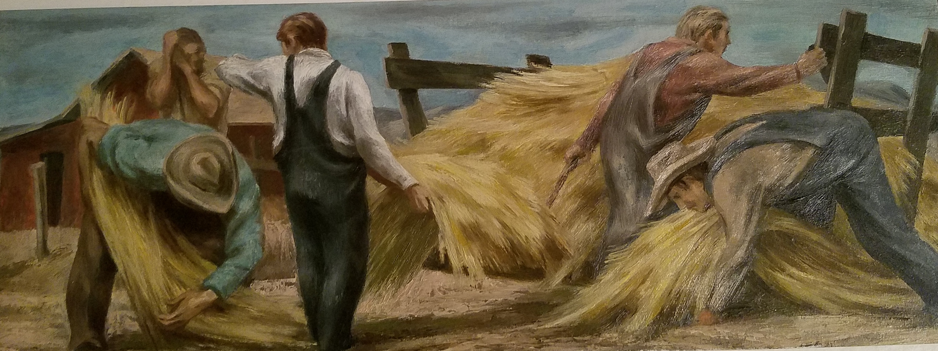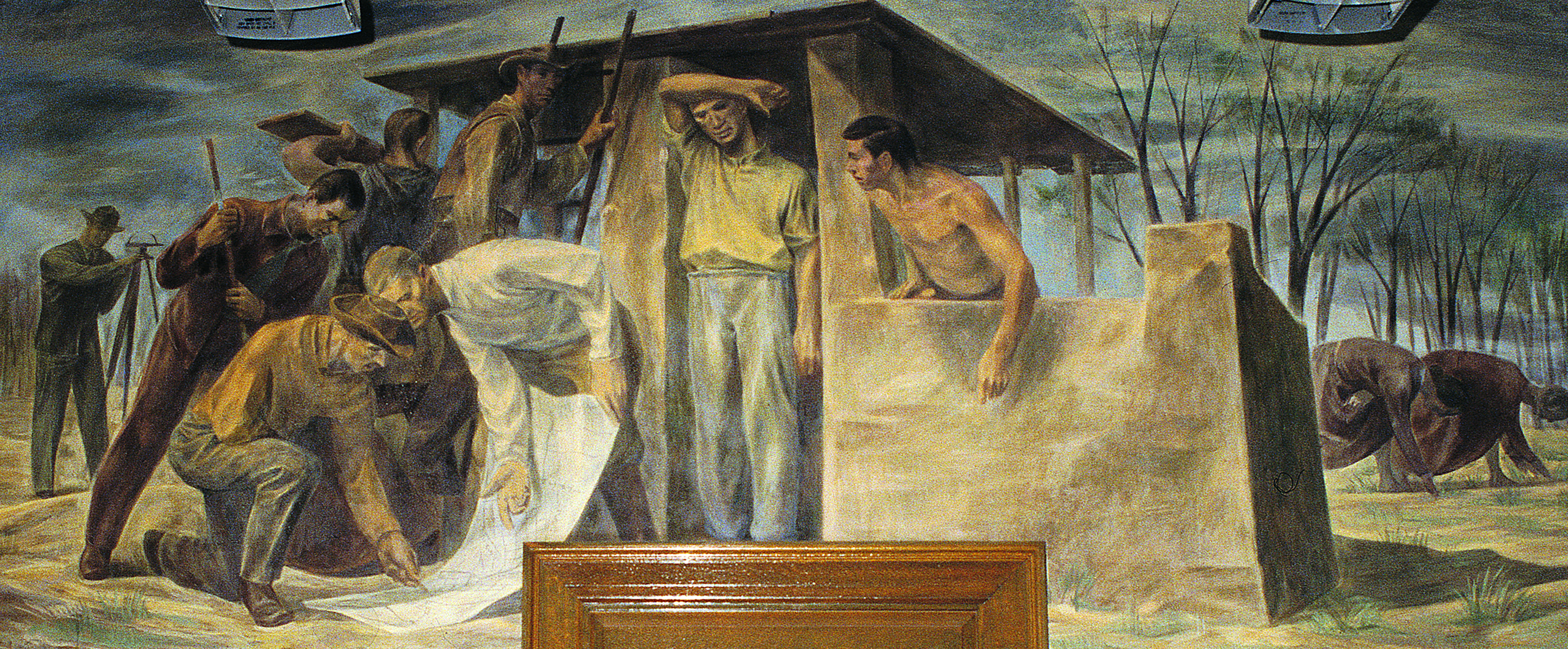 Arnest won the commission for the post office in Wellington, Texas , in 1939 and the following year installed the completed mural, where it remains in its original location. Titled Settlers on the Texas Plains and executed in a combination of tempera and oil on canvas, the mural shows a group of people building a shelter and sowing crops on the Texas plains, “fundamental activities,” in his words, “of opening and using a new land.”