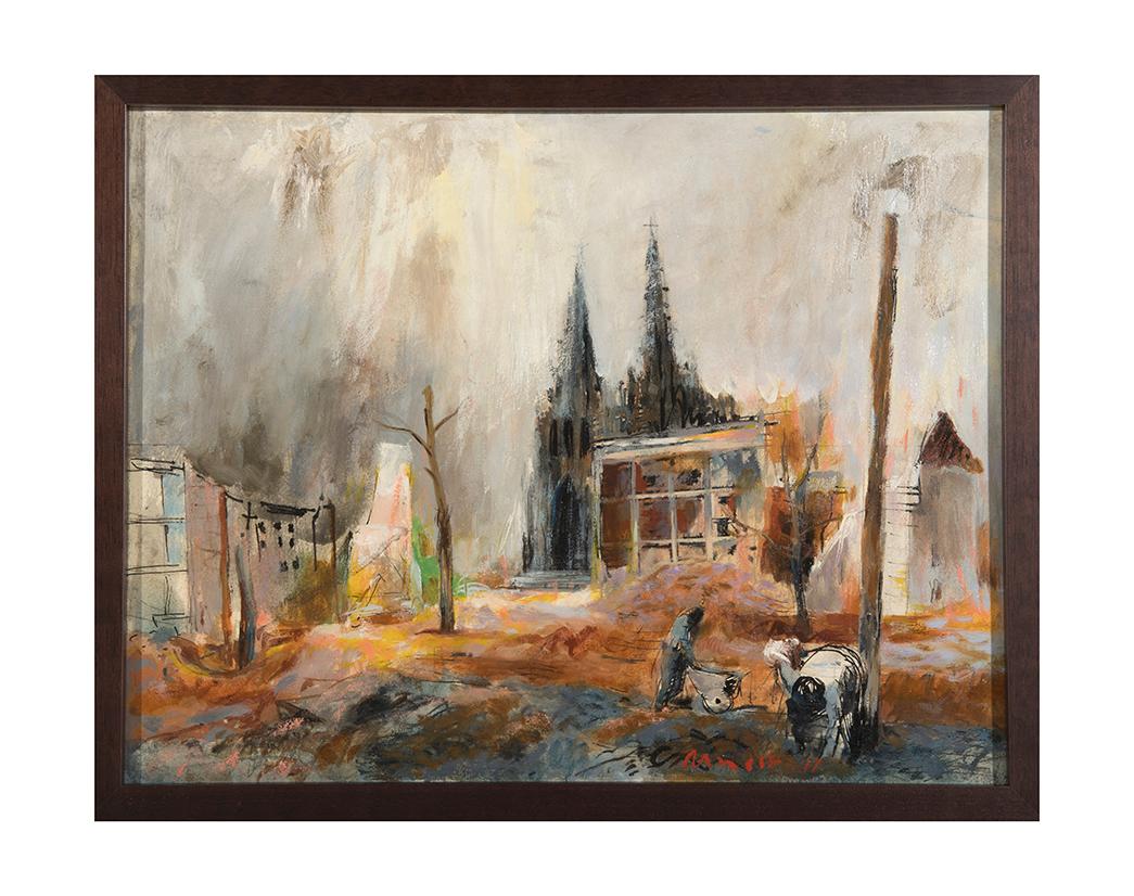 Arnest served as the section’s Chief War Artist through the end of the war. While not specifically schooled for war art, he—like many of his fellow war artists—had been trained in representation, imaging, and picturing surrounded by the political and economic turmoil of the 1930s and the Great Depression, which conditioned them for recording the Western European wartime theater. Arnest worked in England, France, Germany, Belgium, and the Netherlands, sketching and painting vignettes of American Army life, Buchenwald concentration camp prisoners, the meeting of Soviet and American troops at Strehla on the Elbe River in 1945, and the ruins of bombed-out towns and cities in which civilians tried to survive. He also received a Bronze Star for helping a rescue mission near a minefield in Aachen, Germany.