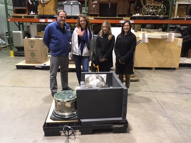Brad Swartzwelter, Kimberly Kronwall, Tiffany Owens, Maria, DeLibero visiting the Moffat Loving Cup in History Colorado’s off-site storage November 2018.