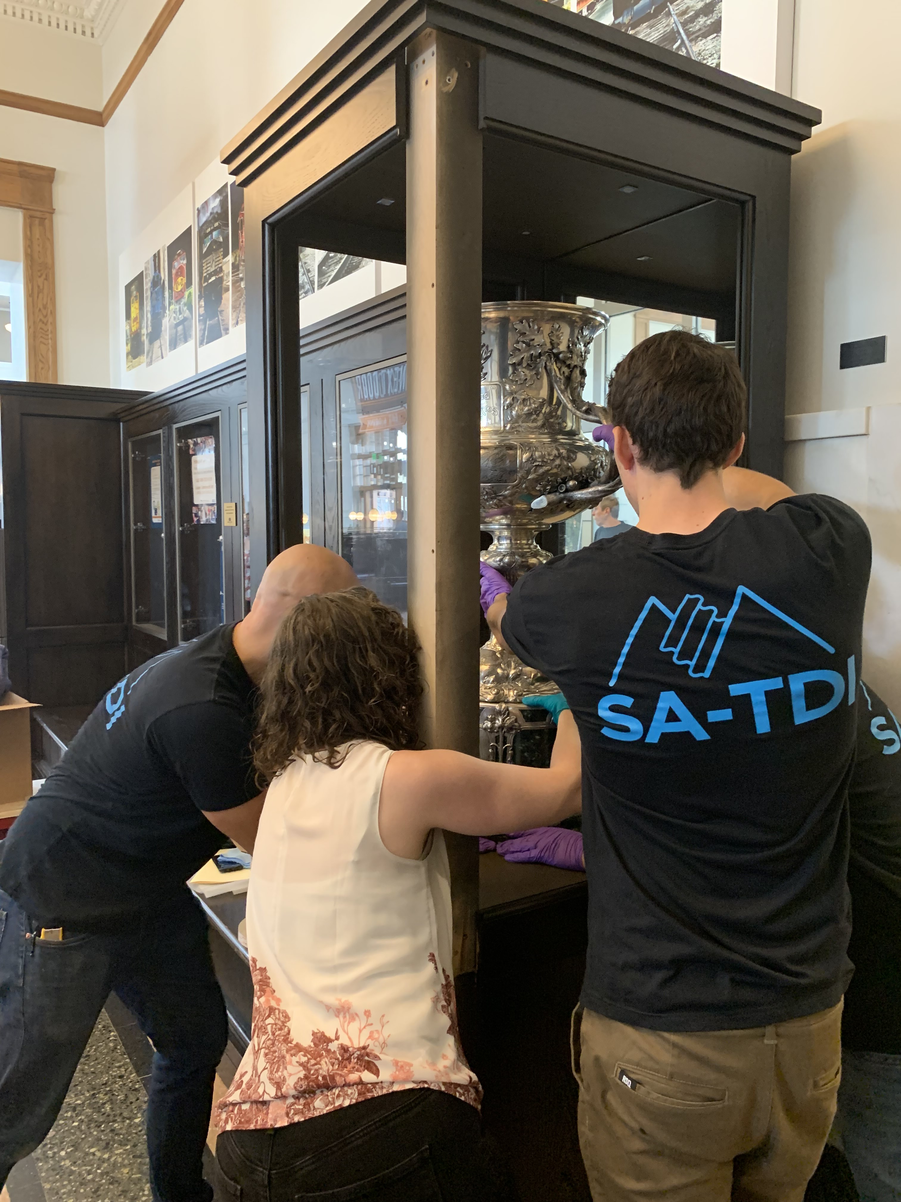 Moffat Loving Cup being installed within the case at Union Station by History Colorado and SA-TDI.