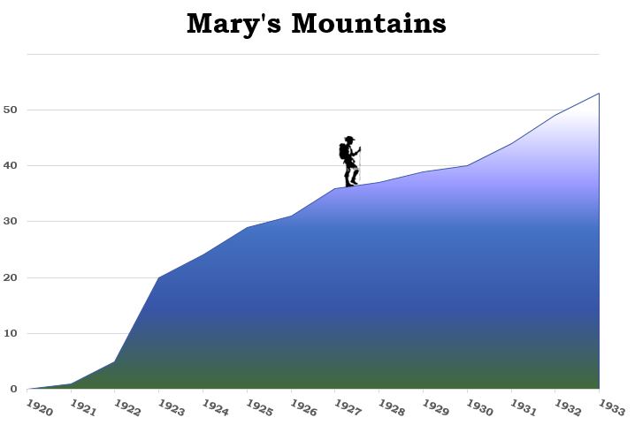 This graph shows Mary Cronin's bagging of all fifty-three of Colorado's fourteeners in only twelve years. With the help of Agnes Vaille, in 1923 alone she climbed fifteen new fourteeners.