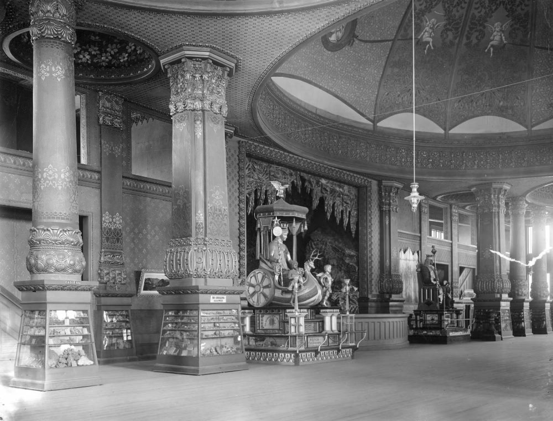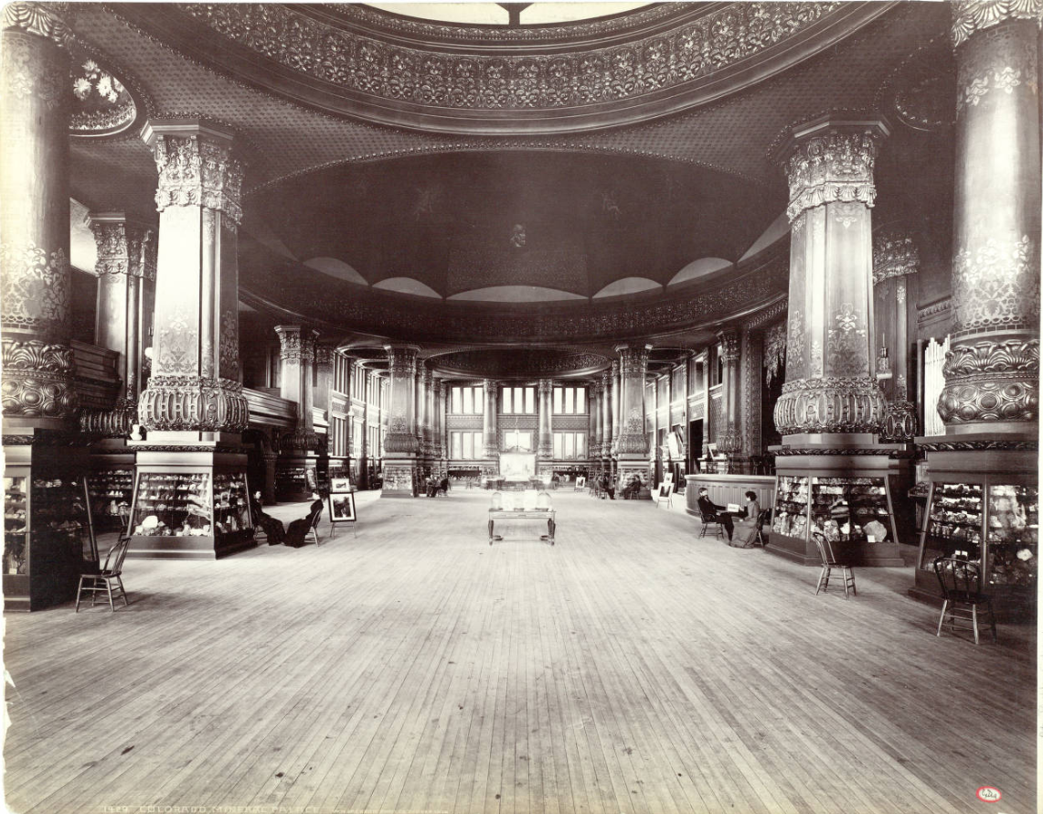 One of the earliest known photos of the palace, taken by famed photographer William Henry Jackson between July and September, 1891. Notice the gilded columns with mineral displays at the base, and the people freely socializing at benches and tables. The Colorado Mineral Palace stood for only 52 years.