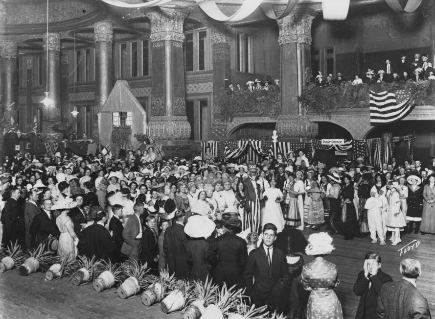Public celebrations were held frequently at the palace, which could accommodate over three thousand guests. This fourth of July celebration was held in or around 1910 and had a significant turnout.