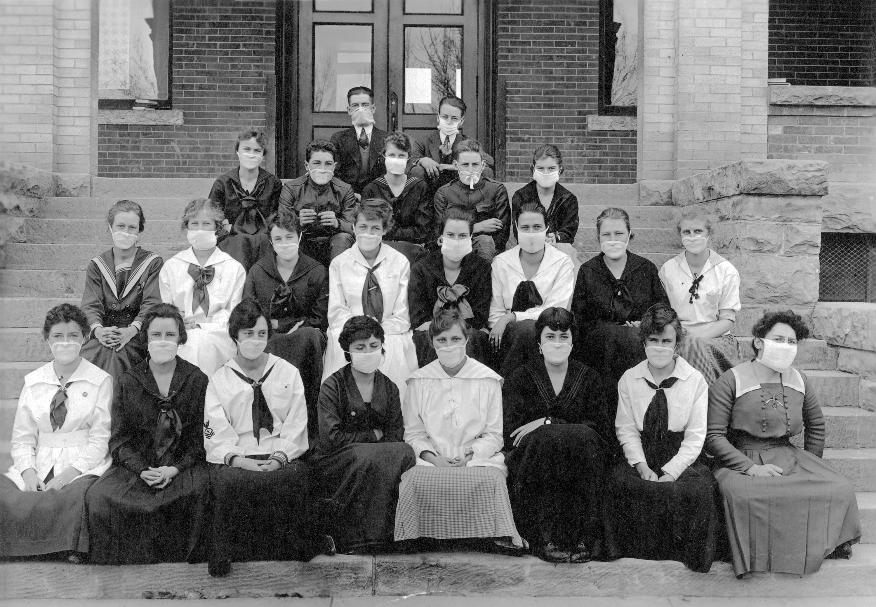 Twenty-three high school students sit on the front steps of their school. Every student is wearing mask covering their noses and mouths as protection from the flu.