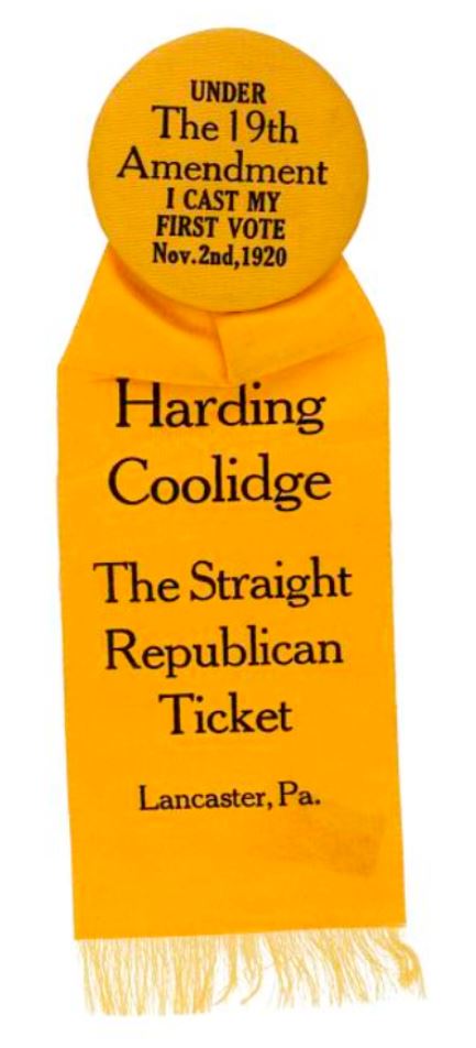 Photo of a bright yellow badge and ribbon to be worn by a woman voter in the 1920 election. It reads, in full: "Under the 19th Amendment I cast my first vote. Nov 2nd, 1920." Below that button, the slogan continues by saying, "Harding Coolidge. The Straight Republican Ticket. Lancaster, PA"