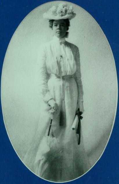 Photo portrait of a well-dressed woman from 1902, with hat, parasol, and long dress