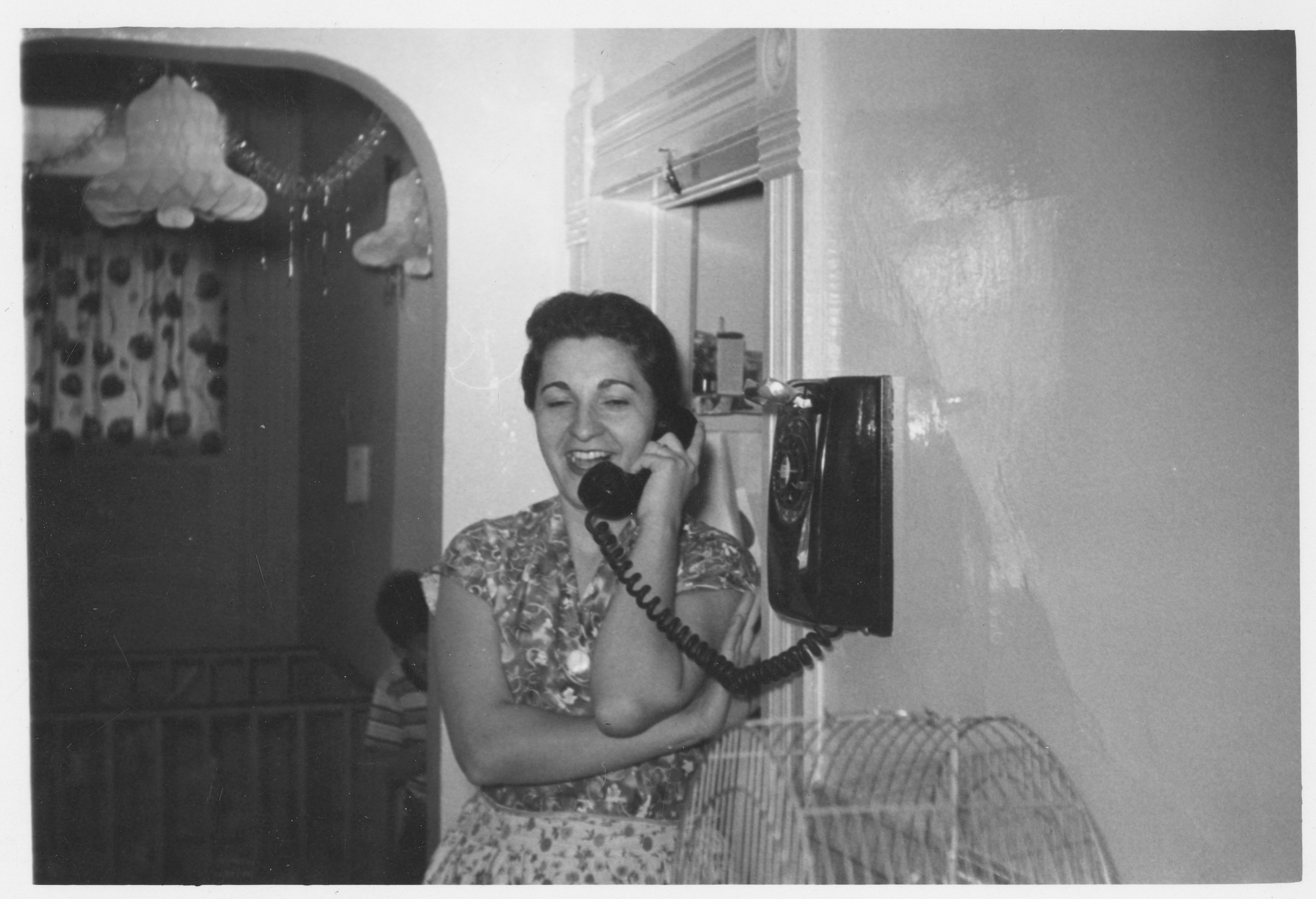 Photo of a woman talking on the telephone, around 1955. She is wearing a dress with a belt, and she has short dark hair. She is standing in a hallway, leaning against the wall to talk on the wall-mounted telephone. A holiday decoration made of paper in the shape of a bell hangs from the ceiling behind her. She is smiling while she chats on the phone.