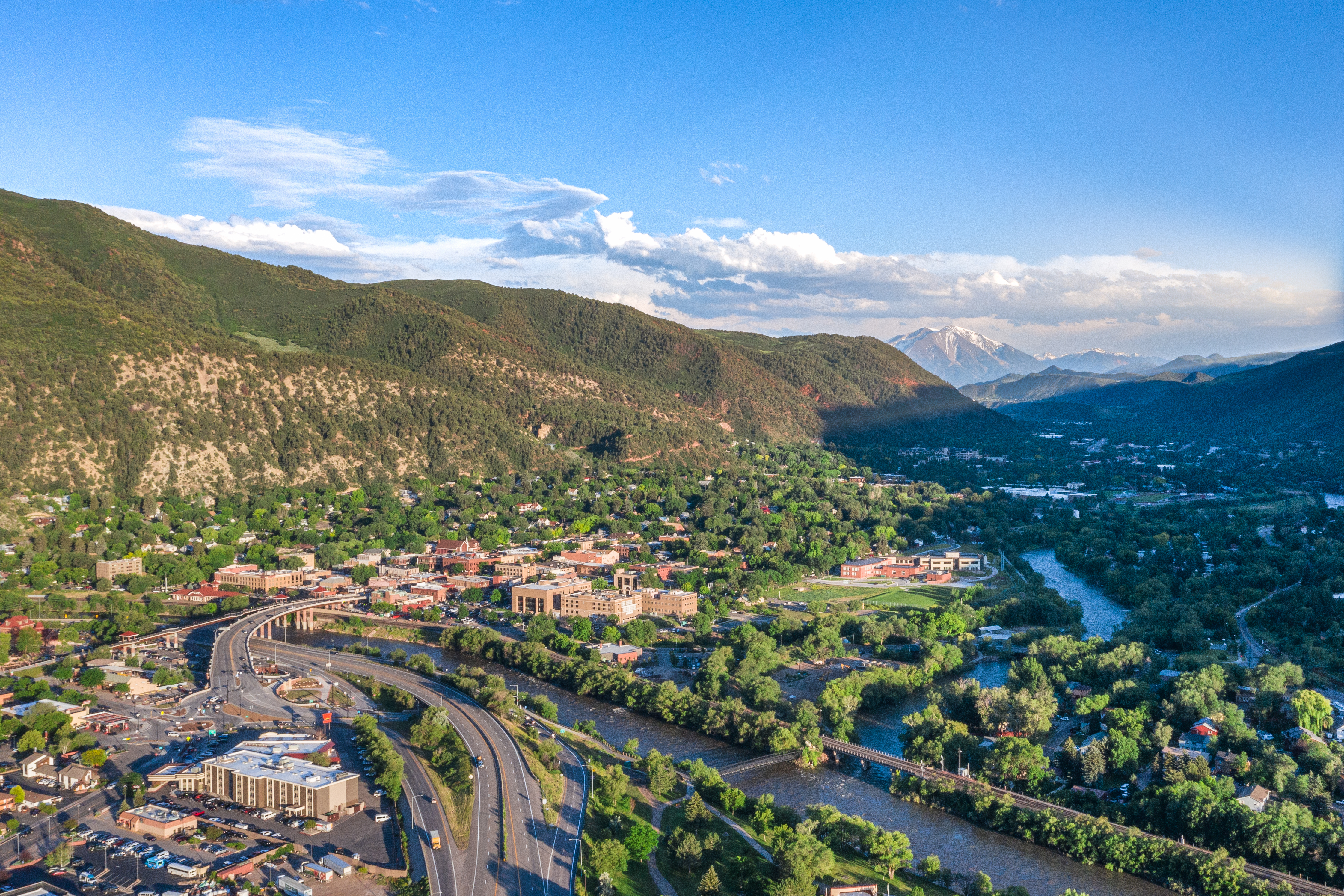 Aerial view of the Town of Glenwood Springs, Colorado in the Roaring Fork Valley and the Grand Avenue Bridge going over the Colorado River.