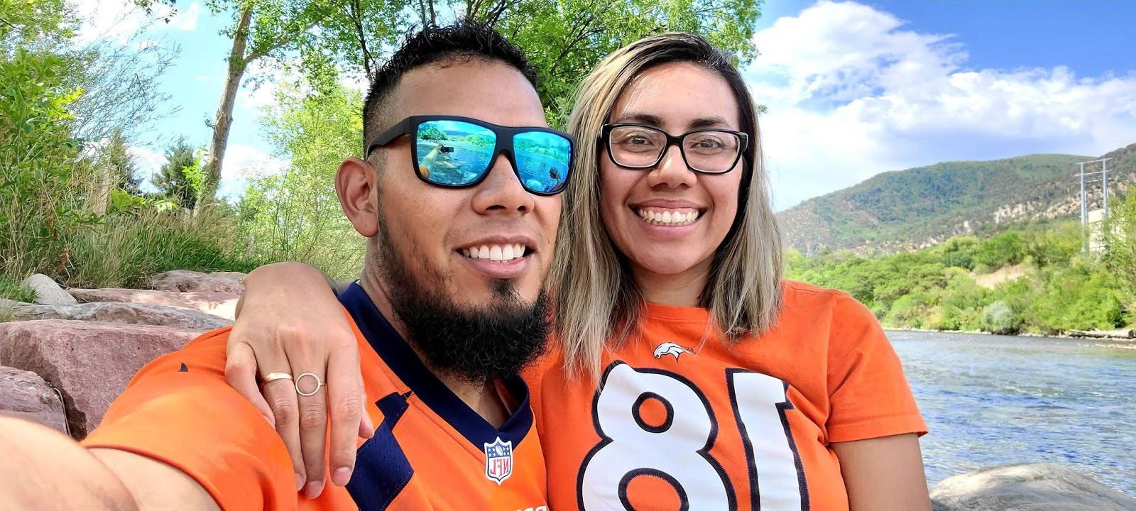 Kelvin Martinez and compañera pose in Broncos shirts.