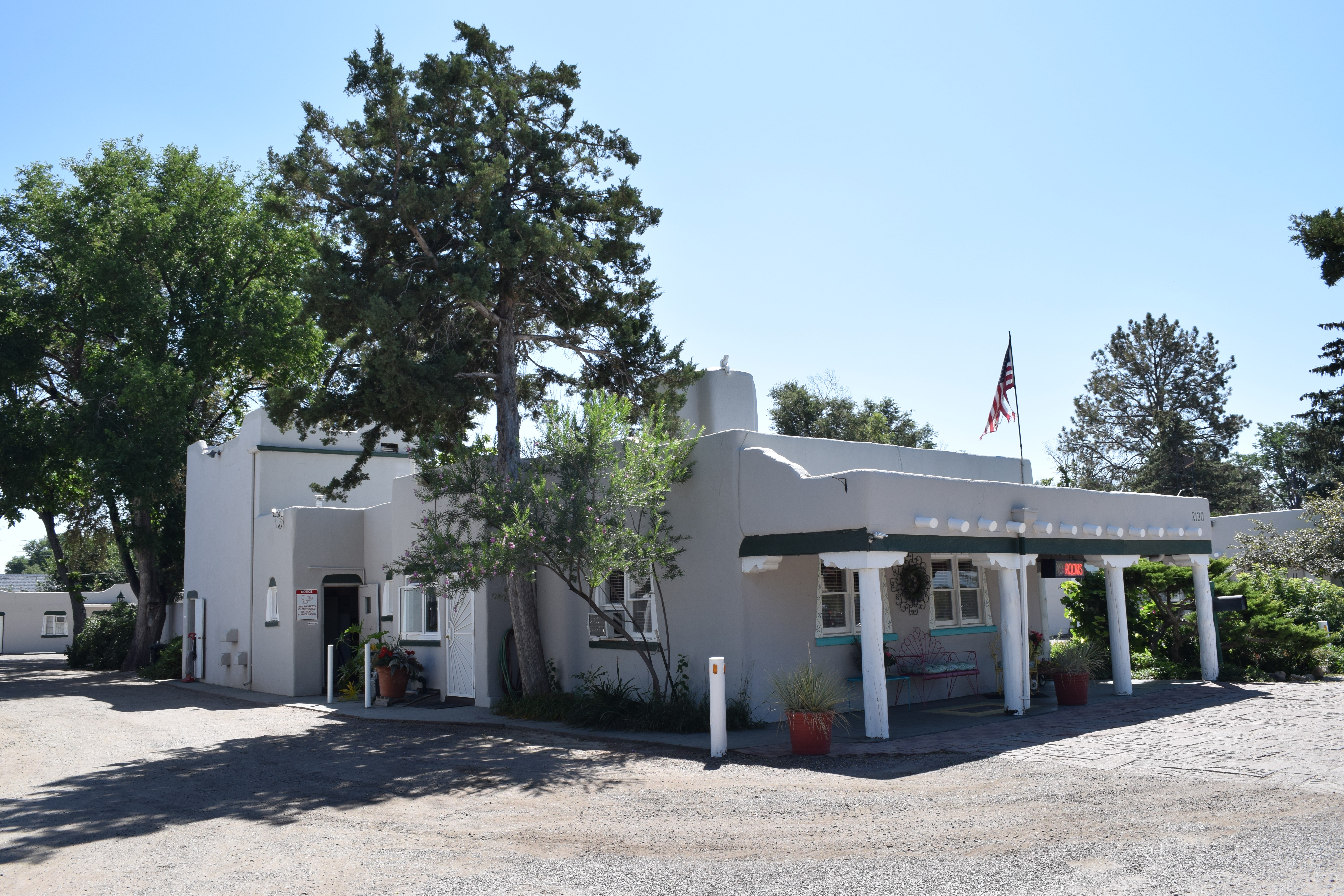 A white pueblo style building with four pillars in front, surrounded by trees.