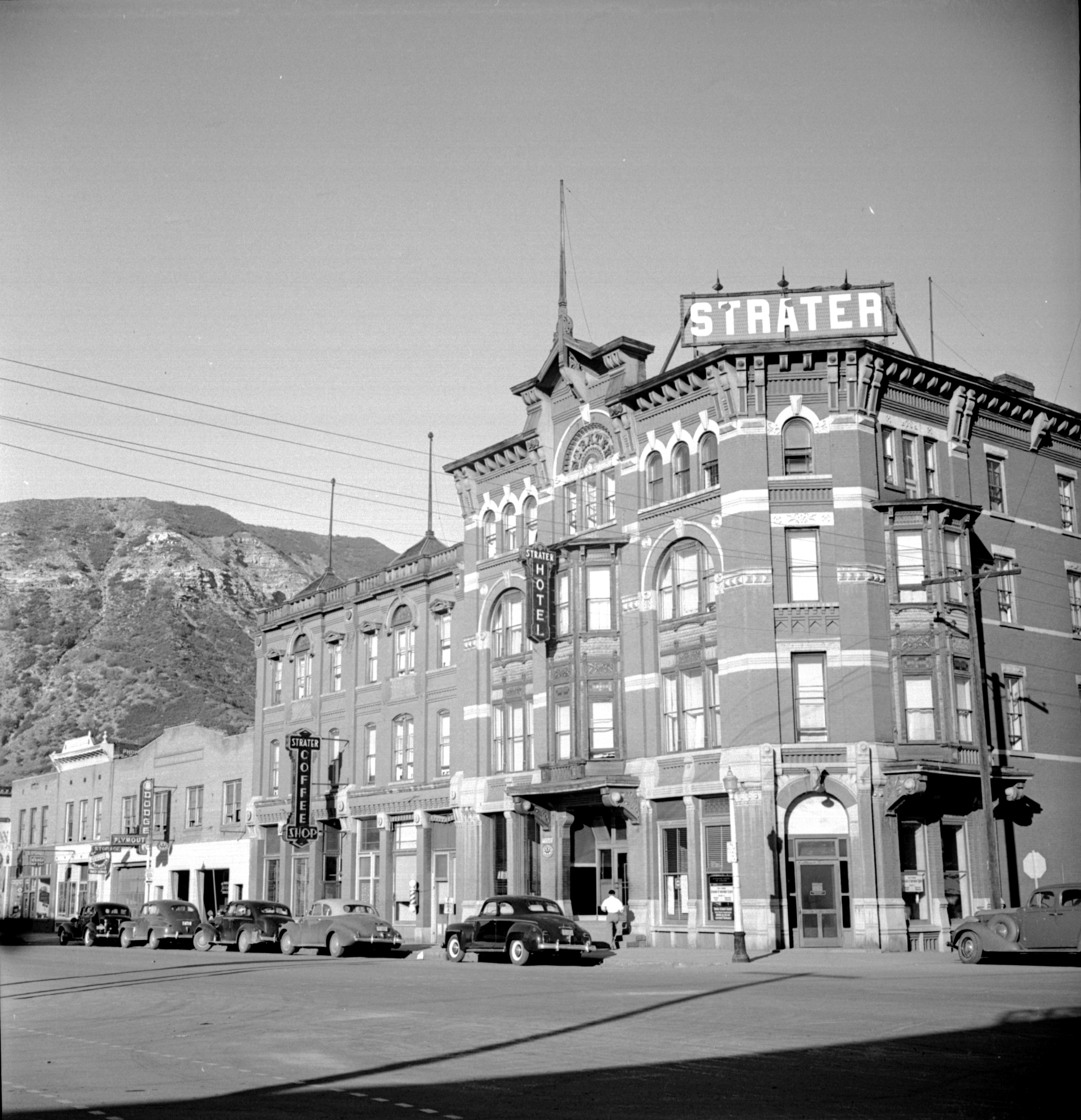 Photo of a 4-story brick hotel building. The building in a dark brick with white detail. Many arched windows and an arched front door way on the corner decorate the building. A large sign on the roof above the front door says "STRATER" in large white block letters. Illuminated signs saying "Strater Hotel" and :Strater Coffee Shop" hang from the side of the buildings. Cars are parked along the street in front of the building and someone is walking along the sidewalk.