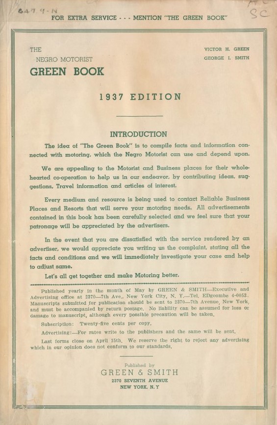 Image of the cover of the Negro Motorist Green Book, 1937 edition. Published by Green & Smith. The cover is of white paper printed with green ink. "Introduction: The idea of 'The Green Book' is to compile facts and information connected with motoring, which the Negro Motorist can use and depend upon."