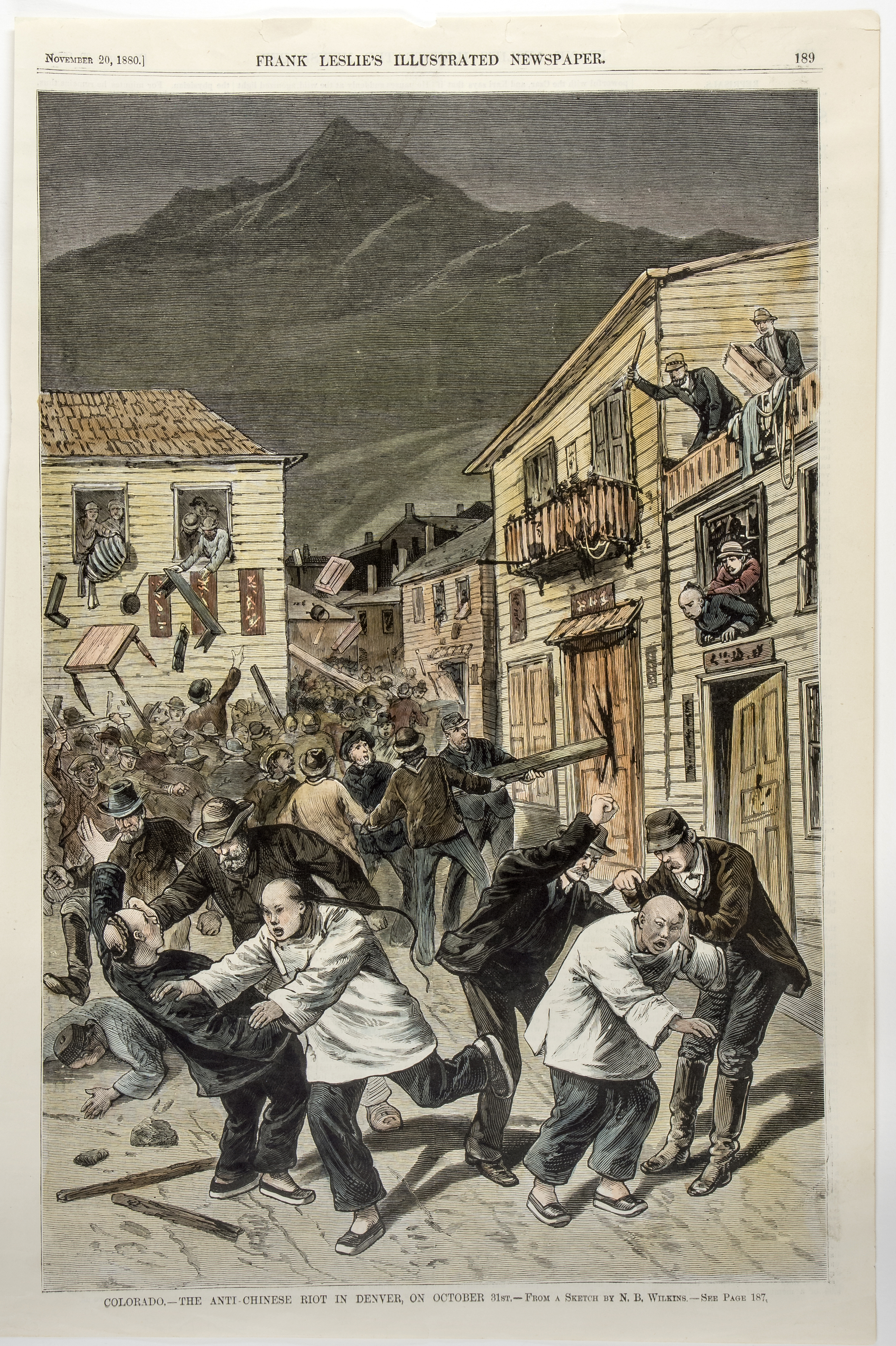 An author's illustration of the anti-Chinese riot that erupted in Denver on October 31, 1880, published in Frank Leslie's Illustrated Newspaper the following month.