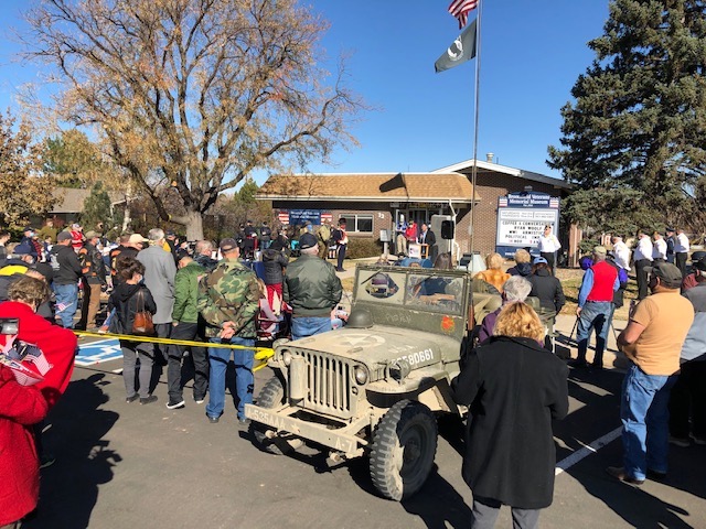 A shot of the crowd at the 2020 Veterans Memorial Day event at the Broomfield Veterans Memorial Museum, November 11, 2020.  Many of the attendees are shown wearing masks and distancing as the flag is raised.