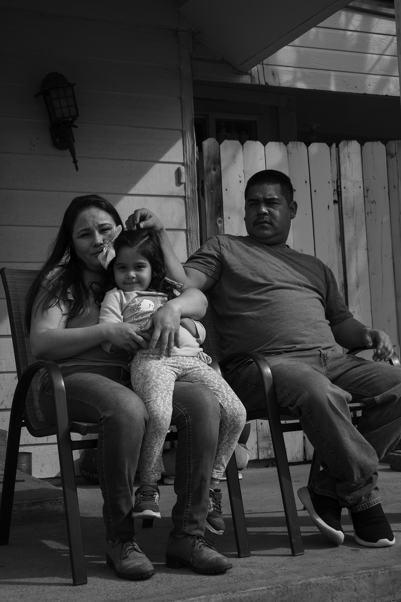 A family sits on a porch. A man sits on a chair to the right, while a woman sits on a chair to the left with a young girl in her lap.