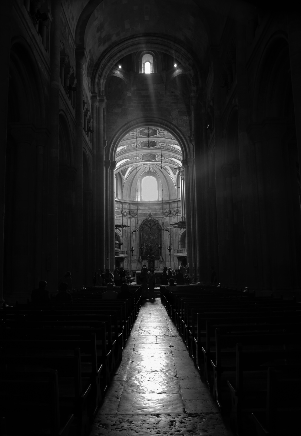 A dark view of a church interior, with pews on either side and the altar straight ahead.